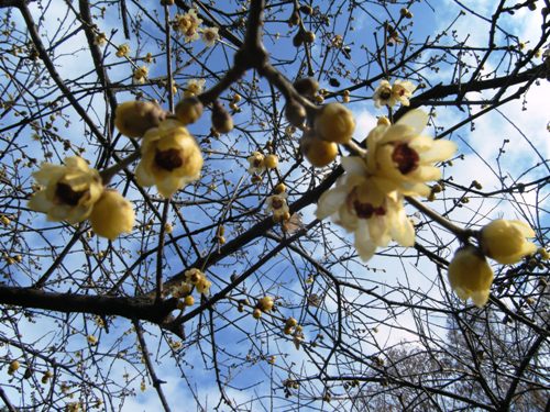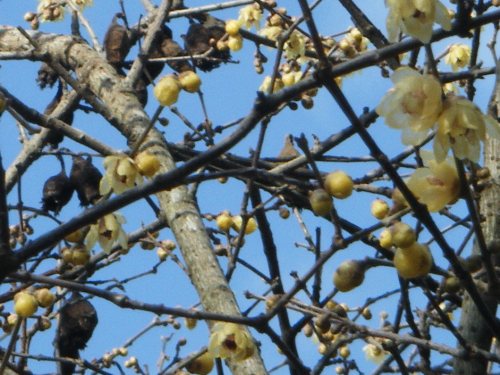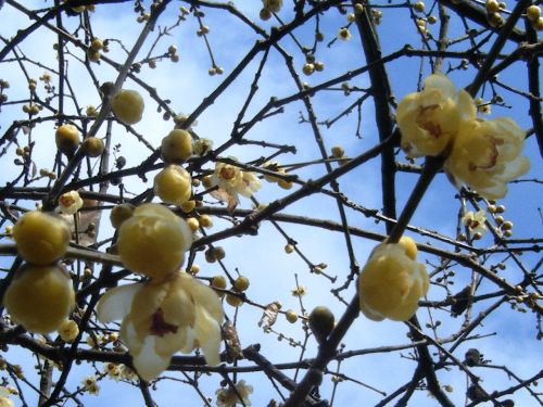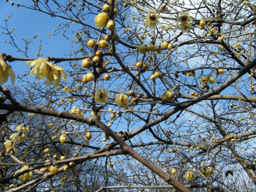 青空の下で、綺麗なロウバイが咲いています。まだ、満開ではなく、五分咲き位でしょうか。