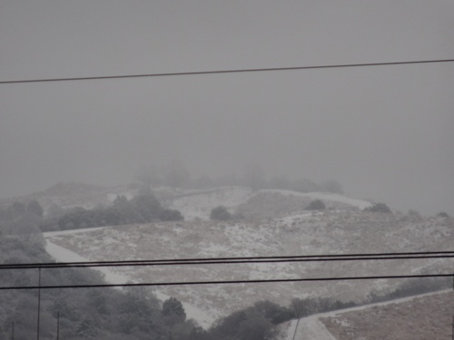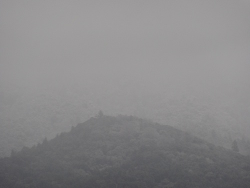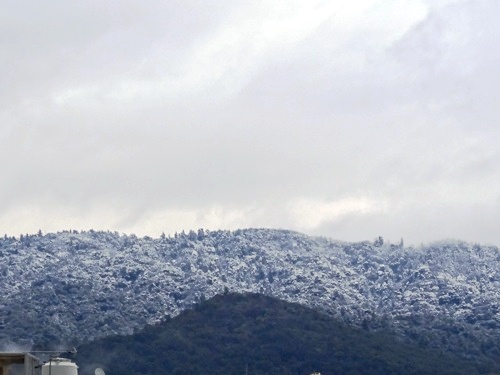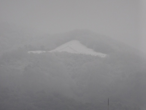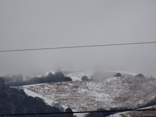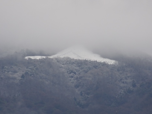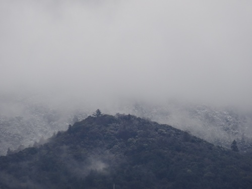 午前11時過ぎ、いつも窓から見える三つの山が、もやで煙っていますが、山頂が少し白くなっています。