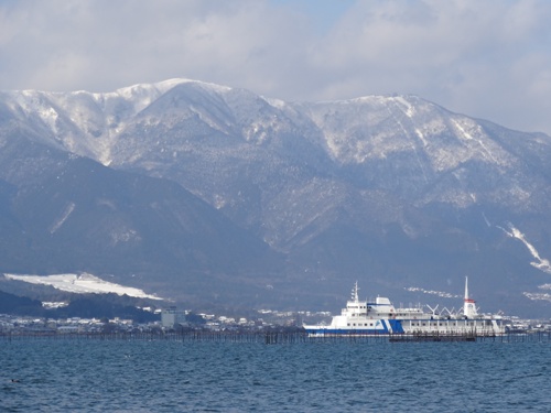 比良山系を借景に遊覧船が通ります。