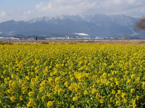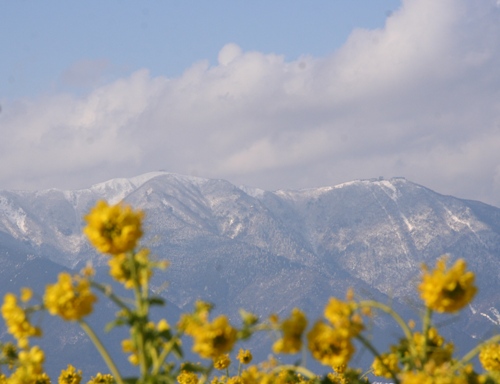 雪を冠った比良山と菜花