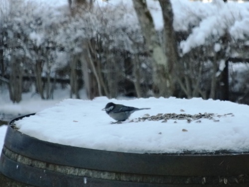 その窓越しのお庭に野鳥の餌台があり、たくさんの小鳥が集まってました。