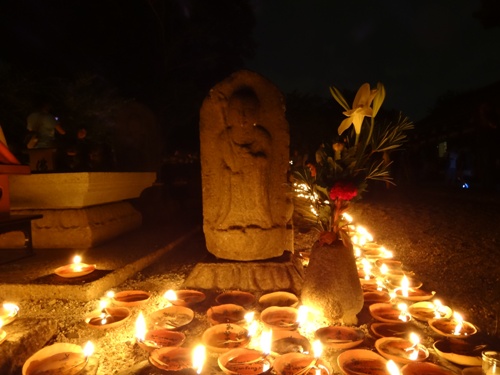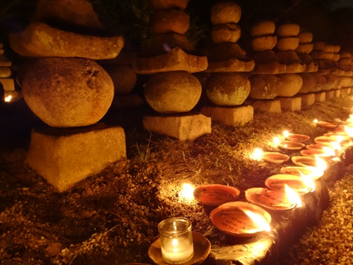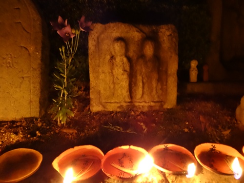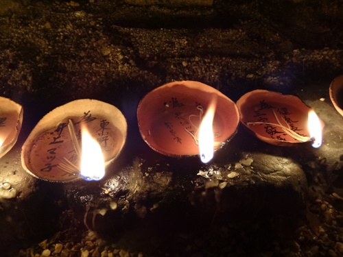 灯明皿に菜種油を注ぎ、灯明芯に点火します。