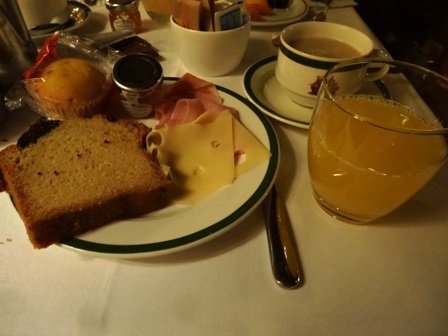 ホテルで朝食 パン、フルーツに生ハムとチーズ