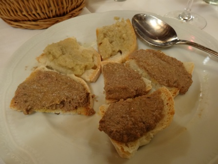 「クロスティーニ」チキンレバーのペーストをパンの上に乗せた物。