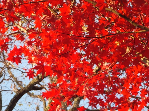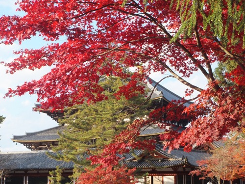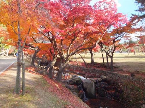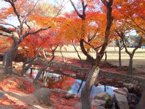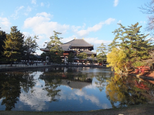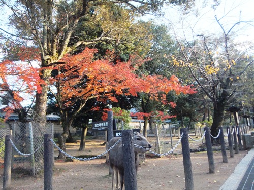 11/29(金)の大仏殿付近の様子です。 奈良公園の真ん中を流れる吉城川(よしきがわ) 川面も真っ赤です。 大仏殿を借景に 太陽の日を浴びて真っ赤 鏡池越しの中門と大仏殿 紅葉と鹿 この鹿さん鎖をカミカミ…