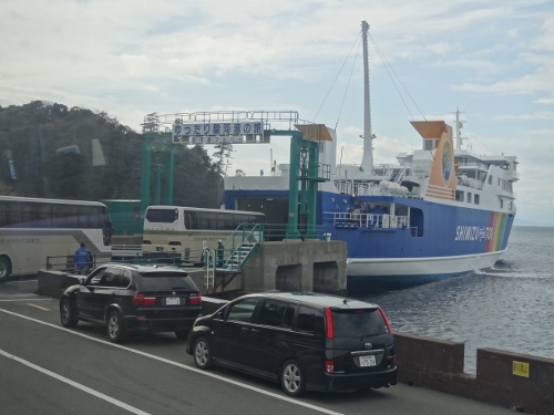 次は、フェリーで、相模湾を移動します。バスごと移動です。