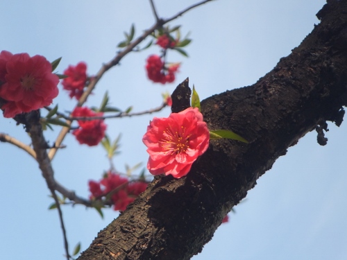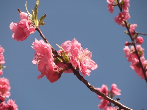 桃の花は色が濃いですね。桜よりも花弁が大きいので、