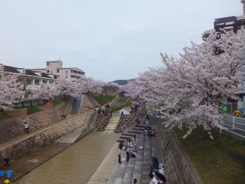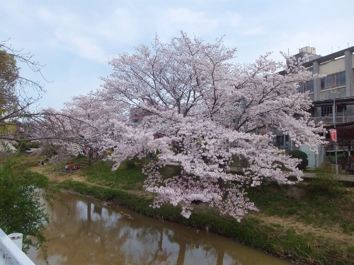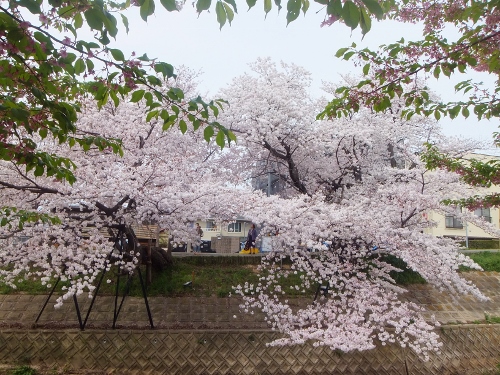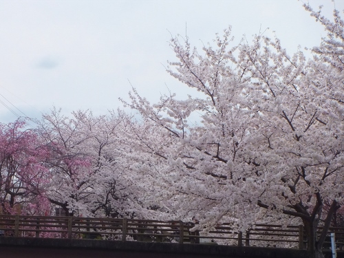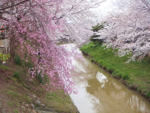 ソメイヨシノとしだれ桜の競演。水がちょっと濁っていますね。