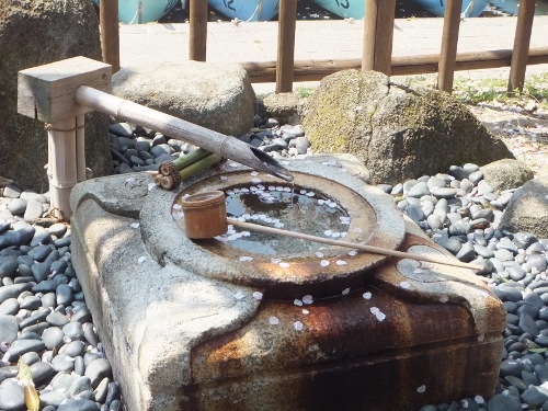 水琴窟の上に桜の花びらが落ちて良い雰囲気です。