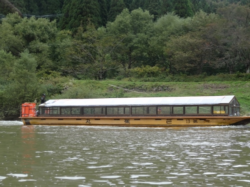 最上川の船下りです。船中でお弁当を頂きます。船頭さんが案内をしてくれますが、