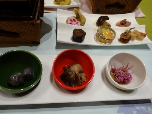 口取り 茄子もみじ焼き 鴨ロースト 本しめじ漬け焼き 秋の風流よせ