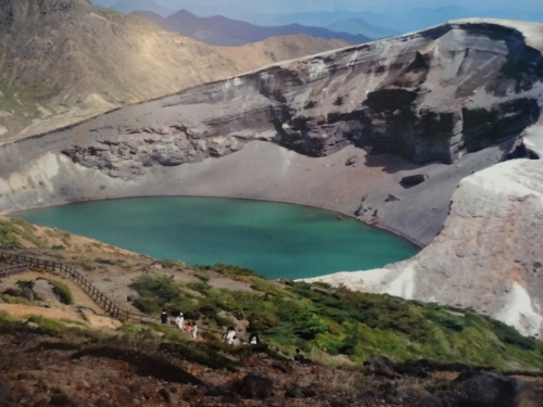 山頂に着きました。これが、お釜です。でも、これは、ただのパネル写真です。