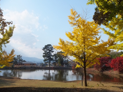 みとりゐ池の横の紅葉。この時は、ちょっと曇ってました。