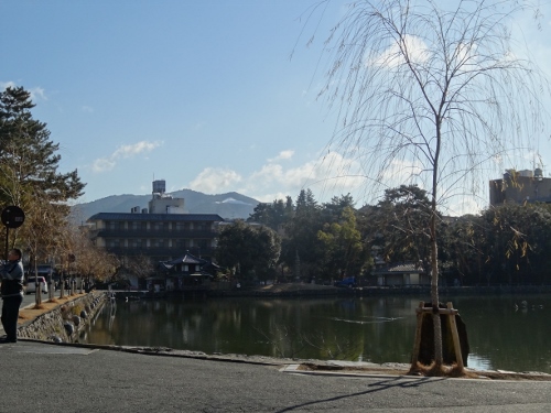 猿沢池 人は少ないようですね。高円山の雪がまだ少し残っています。