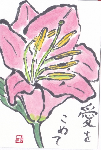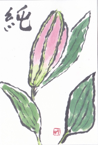 教室では、まだユリが蕾だったので、開いてから、自宅で描きました。