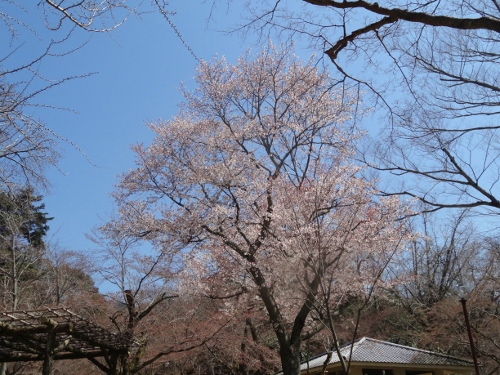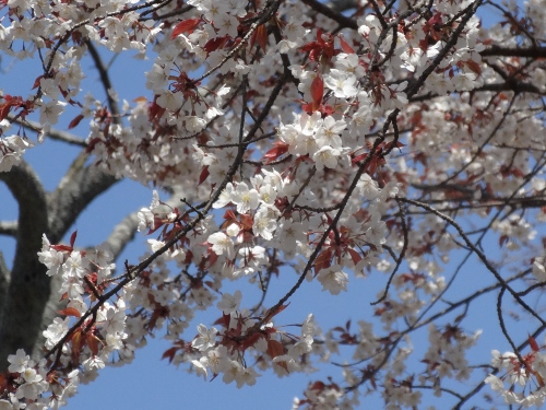 コヒガンザクラはまだ五分咲きですが、青空の下の桜は綺麗です。