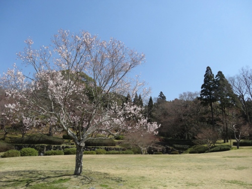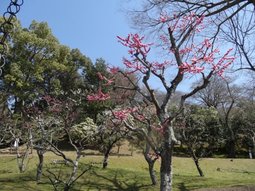 梅林の梅がまだ咲いていました。向こうの白いのは、アセビです。