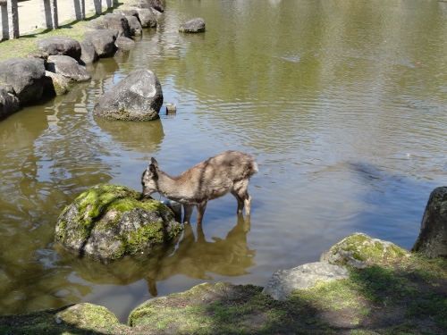 この日はとても暑くて、鹿が池の中に入っていました。