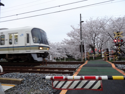 桜とJRみやこ路快速を撮ろうと踏切で粘りました。