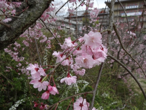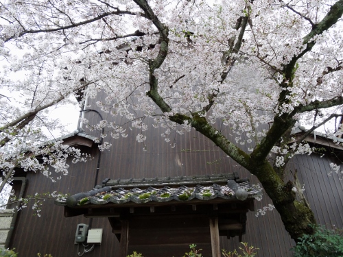 どこかのお宅の庭の桜の木。幹が苔むしていて素敵です。屋根瓦にも苔が。