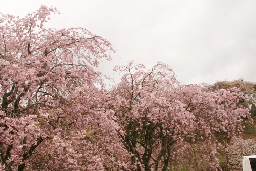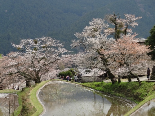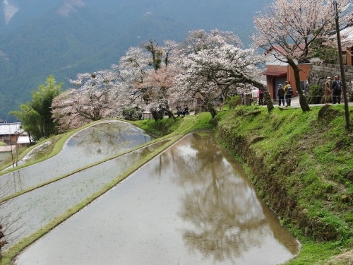 お天気が良ければ、水田に桜が綺麗に映るのですが、あいにく曇りで残念です。