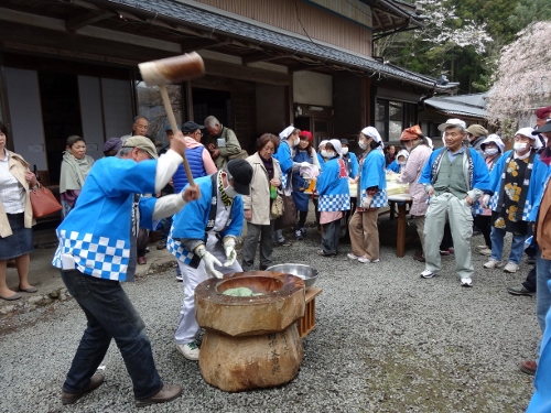 お餅つきをやってました。ヨモギ餅を頂きました。