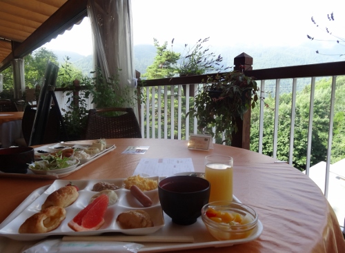 朝食のバイキングをテラスで頂く。真夏とは思えない涼しさ。