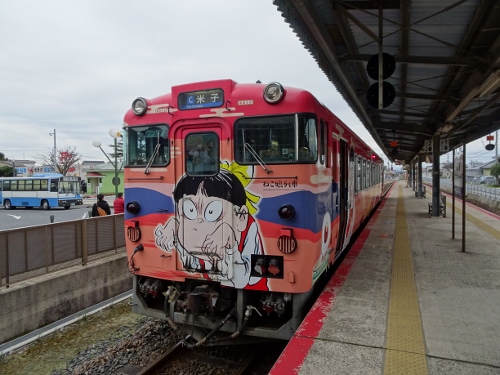 境港線の鬼太郎列車 行きは、ねこ娘列車 一両編成