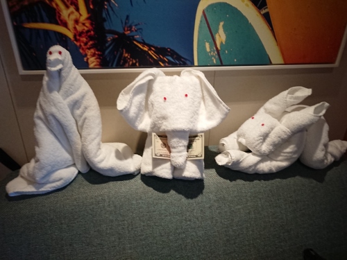チップを払う必要はありませんが、特別にタオルアートをして下さった船室係の方に、