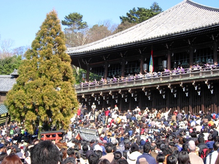 東大寺二月堂の豆まきの様子です。