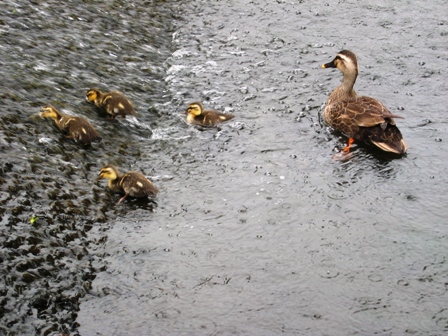 ところが、私が見たのは、そうではありません。赤ちゃん達が凄い急な坂を必死で登る訓練をしているんです。嫌、遊んでるだけなのかもしれませんが、私にはそう見えました。それをお母さんが下からずっと眺めているんです。赤ちゃん達は水の流れに逆らいながら凄い頑張っています。今度はお母さんが登り始めて、赤ちゃん達を上から見つめています。そして、無事4羽共ゴールしました。