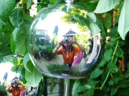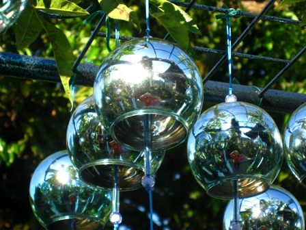 緑色のミラーボールの様な風鈴 太陽が光って眩しい。