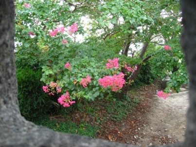 石灯籠から見える花は何でしょう?百日紅かな。