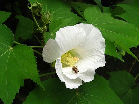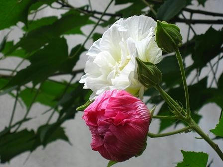 今年は橘寺に酔芙蓉が咲いていると聞いてお参りしたのですが、名札が無いのでどれだか分からず、ひとつの株に白と赤の花があるのがそれだろうと見当をつけ、手入れをしている方に訊ねたら『そうですよ』と教えてくれました。