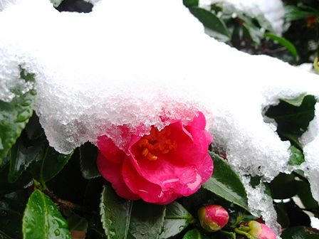 満開の寒椿(獅子頭)にも雪が積もっています。
