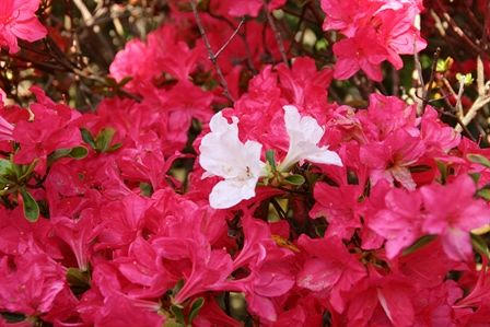 赤いツツジの中に白いツツジが。「逆・紅一点」です。