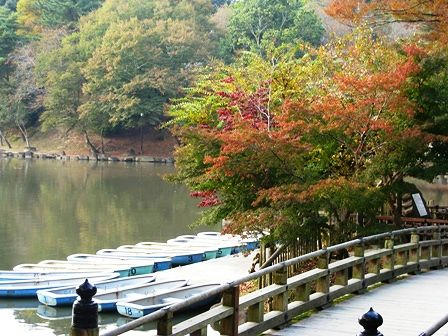 鷺池の紅葉 このボートが並べてある光景が好きなんです。