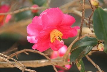 桜の木の隣にピンクの山茶花が満開でまるで桜が咲いているようでした。