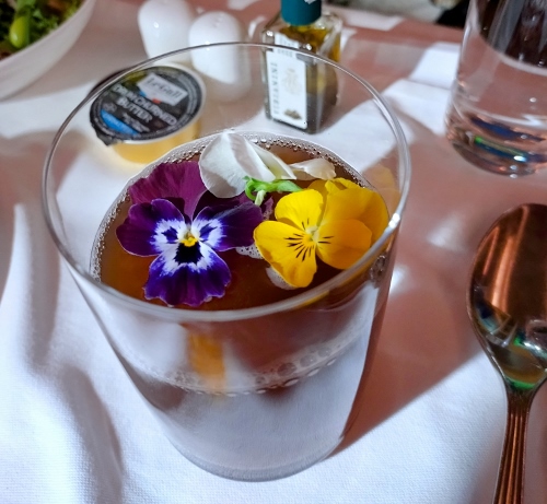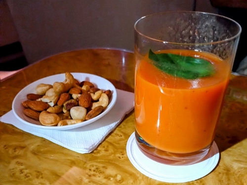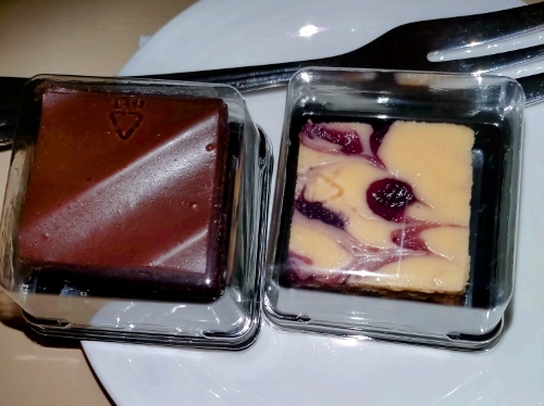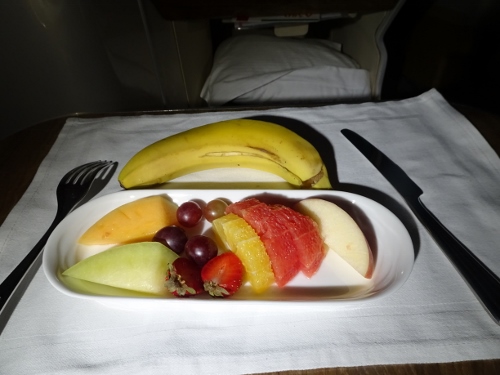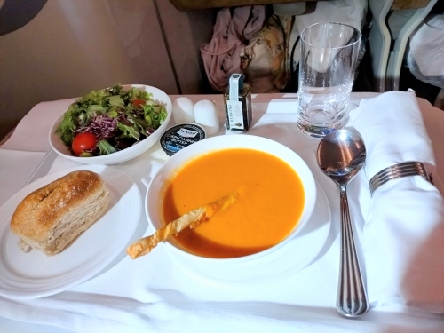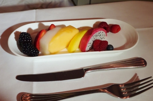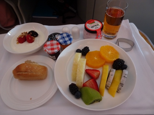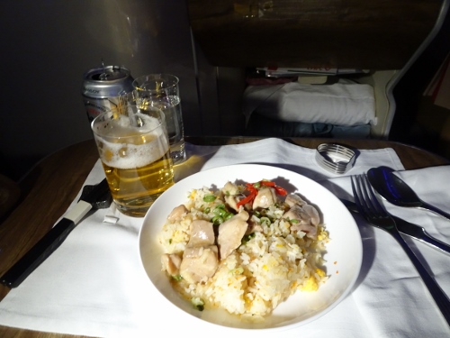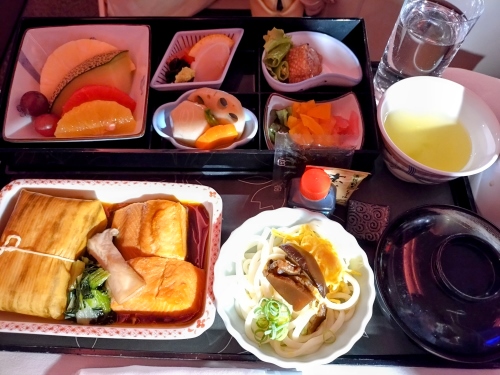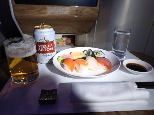 1番の機内での楽しみはお食事です。【軽食】 搭乗してすぐの軽食 「お寿司の盛り合わせ」とビール (私)(ハイネケンを頼んだのに、ステラ・アルトラが出て来ました。)主人は、「チキンのオイスターソース煮 野菜炒飯を添えて」と日本のビール バーラウンジで、オレンジフィズ(モクテル)を飲みました。 一緒にプチケーキも頂きました。 主人はフルーツの盛り合わせ 9/26(木) 【朝食】(実際は深夜)「懐石弁当」お造り:サーモントラウトのタタキとホタテお漬物:ツボ漬けたくあん、青カッパキュウリ、桜漬け鶏肉の照り焼き、サーモントラウトの照り焼き季節の野菜の煮物、味つけしたご飯、味噌汁、うどん、ワサビとねぎを添えて※ちゃんとした和食で美味しかったです。