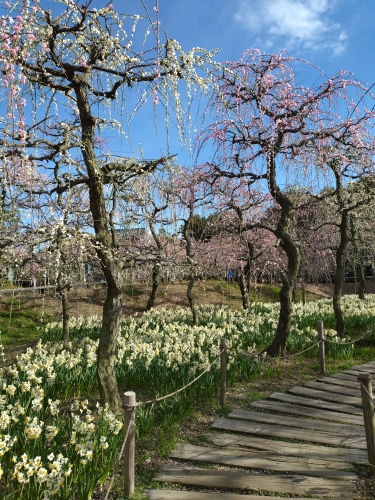 しだれ梅の足元には、スイセンの群生が咲いています。