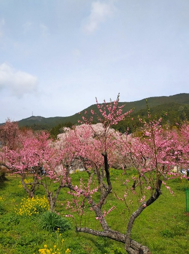 すぐそばに、濃いピンクの桃の花と足元に菜の花が咲いています。