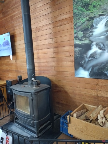 薪のストーブがありました。そしてこの横に貼ってあるポスターを見て、