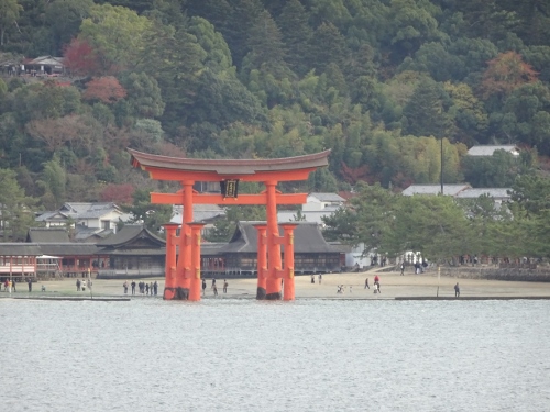 フェリーで宮島へ 船上から大鳥居が見えます。(望遠で撮影)