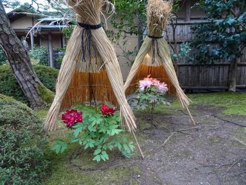 こもを被った寒牡丹 暖冬で雪がないのが残念です。