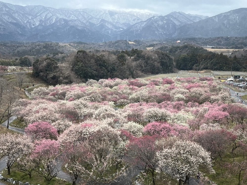 展望台からの眺めです。雪の積もった鈴鹿山脈を借景にした梅林は見事です。